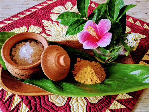 塩入、素焼きポットを温め、ウコンをはじめとする数種のハーブと